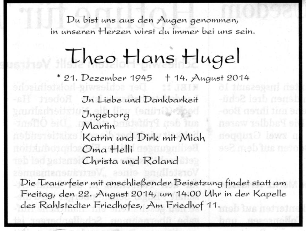 Am 22. August 2014 haben wir Theo Hugel beerdigt. Es waren doch viele ehemalige